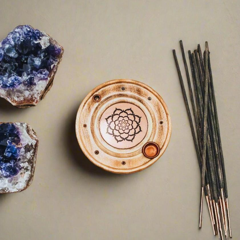 Create the ultimate blend of incense with this Lotus Flower incense holder. Designed with a beautiful round wooden incense base decorated with a lotus flower on a copper plate.