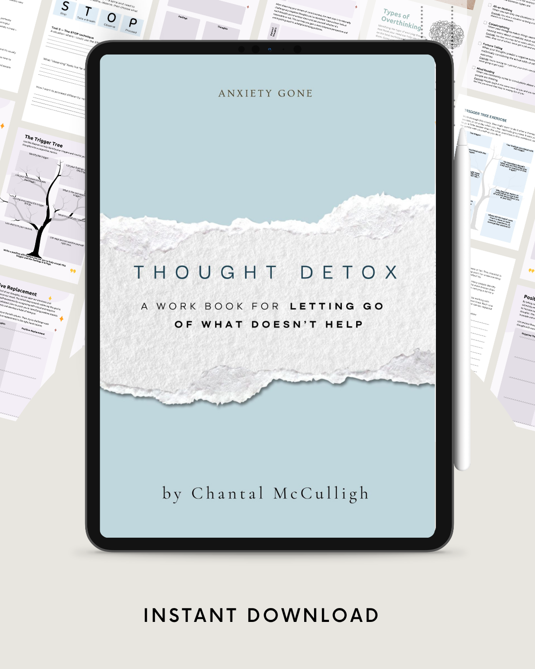 Thought Detox is a warm, practical, CBT-based anxiety workbook that helps you slow down, examine the thoughts that have been running your life, and gently, practically, start letting go and re-phrasing he unhelpful ones.